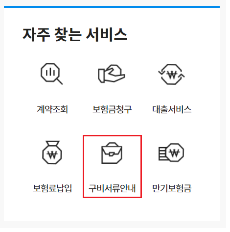 구비서류안내 클릭 후 원하는 서비스 찾아서 보험금청구서와 개인정보처리동의서 다운로드 받으면 됩니다.