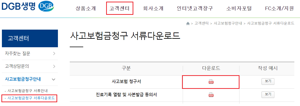ㄴ DGB생명 사이트 -> 상단 고객센터 -> 사고보험금청구안내 -> 사고보험금청구 서류 다운로드