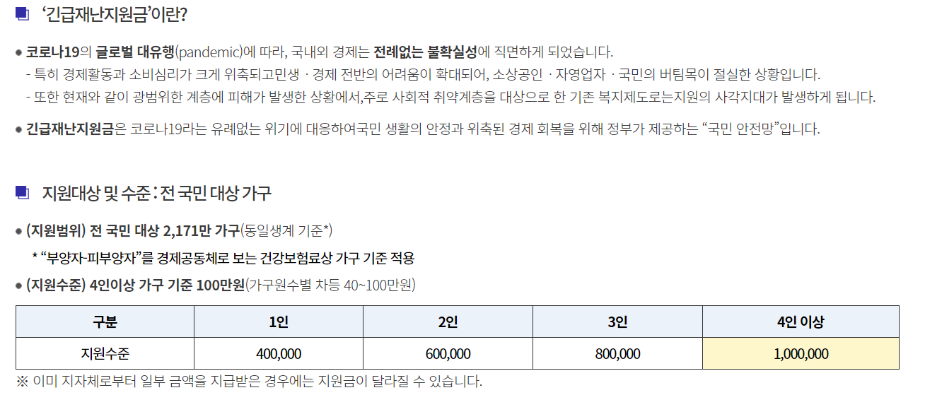 긴급재난지원금은 대한민국 국민 대상으로 코로나19 위기 극복을 위한 정부의 제도 중에 하나입니다.